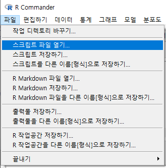 .R 파일은 일반적으로 문서 편집기로 작업을 할 수 있다. R Commander는 입력창과 출력창을 나눠서 작업이 가능하기 때문에, 입력창을 문서 편집기처럼 활용해서 .R 파일을 작업할 수 있다.