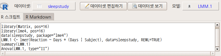 그리고나서, R Commander 상단 메뉴에 있는 < 활성 데이터셋 없음 >, < 활성 모델 없음 > 버튼을 각각 누르면 sleepstudy, LMM.1이라는 데이터셋과 모형을 선택할 수 있다. 선택하면 화면 상단에 '데이터셋: sleepstudy', '모델: LMM.1'이 표시된다.
