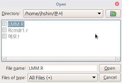 LMM.R 이라는 스크립트를 만들고, 저장했다고 가정하자. R Commander를 시작하고, 경로에서 이 스크립트를 찾아 불러오는 과정이다.