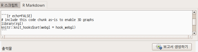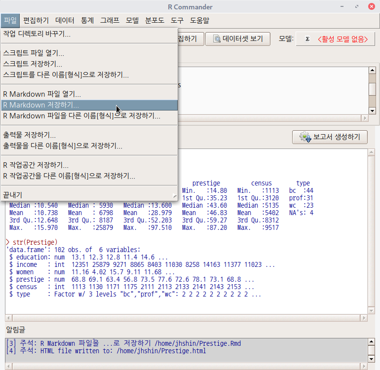 R Commander의 입력창에는 'R 스크립트'창과 함께 'R Markdown'창이 있다. 'R Markdwon'창을 선택하면 <보고서 생성하기>라는 버튼을 등장한다. 'R Markdown'창에 있는 스크립트를 수정하면서 .html 보고서를 만들 수 있다. 이 스크립트를 저장하는 기능이 '파일 > R Markdown 저장하기...'이다.