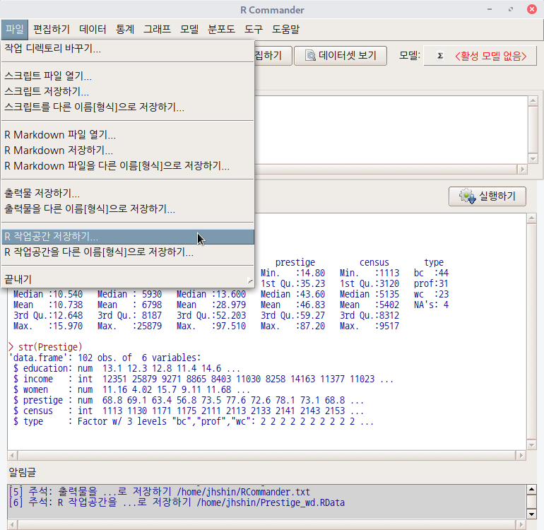 메뉴에 Data > load data set... 이 있다. 이 기능을 통하여 저장된 R 작업공간의 객체들을 다시 불러올 수 있을까. ERROR: There is more than one object in the file, with the following names: Prestige, WD 의 사례가 알림글에 나올 수 있다. 저장된 작업공간을 불러올 경우는 Pull-down 메뉴의 '데이터 > 데이터셋 적재하기...' 기능을 사용하지 말자. 입력창에 바로 load("저장된작업공간파일.RData")를 입력하고 바로 실행하기 버튼을 눌러 불러온다.