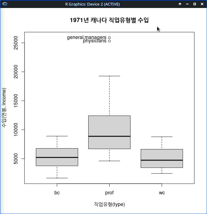 그래픽장치 창에 상자그림이 등장한다. 직업유형의 수준인 bc, prof, wc (블라칼라, 전문직, 화이트칼라) 별로 상자그림이 시각화되어 최소값, 중앙값(median), 최대값과 25%, 75% 수준의 값과 이상치 등이 표시된다.