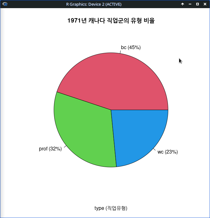 with(Prestige, piechart(type, xlab="type (직업유형)", ylab="",