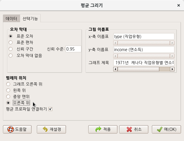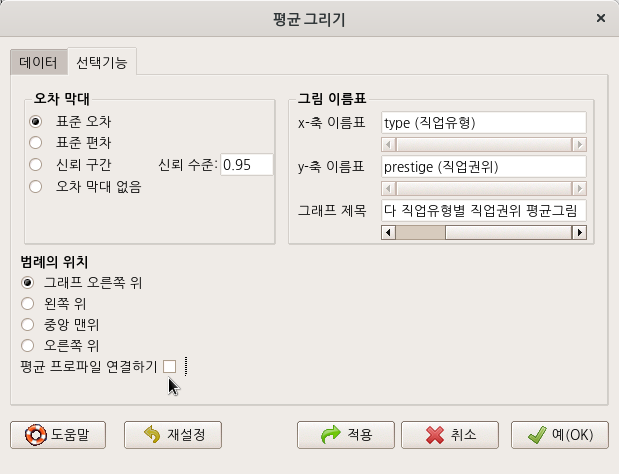 <선택기능> 창에서 <그림 이름표>에 내용적 이해를 돕기 위해 변수이름, 그래프 제목에 설명을 입력하자.