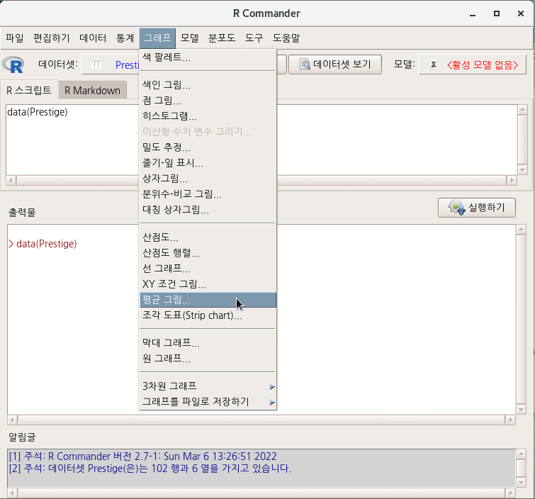 carData 패키지에 있는 Prestige 데이터셋을 활성화시키고, 그래프 메뉴창에 <평균 그림...> 기능을 선택하면 아래와 같은 추가 선택 창이 등장한다. type 이라는 요인형 변수 하나가 Prestige 데이터셋에 있어 자동 선택되며, <반응 변수 (하나 선택)>에서 income (수입, 연소득)을 선택해보자.