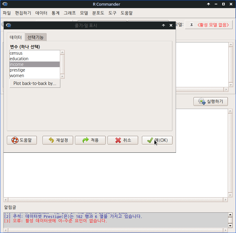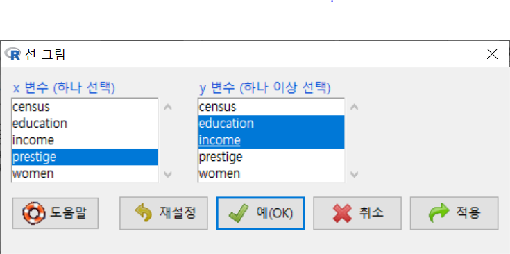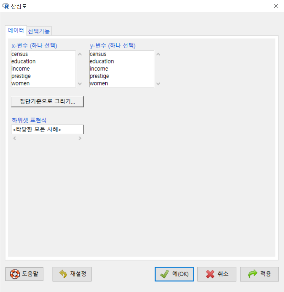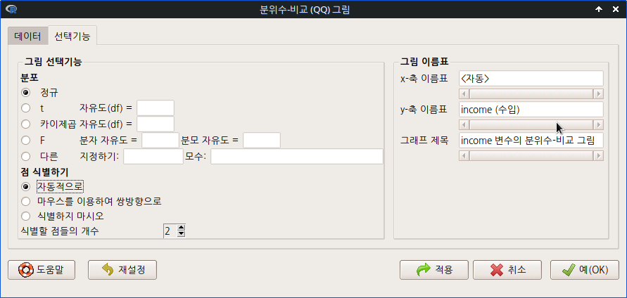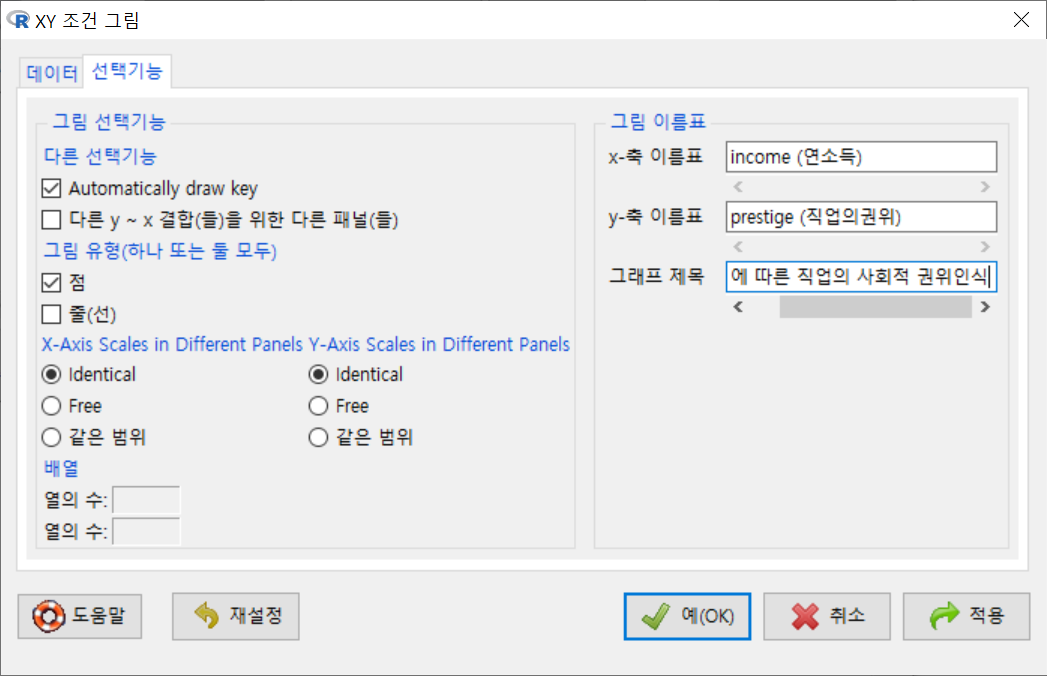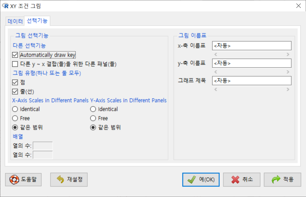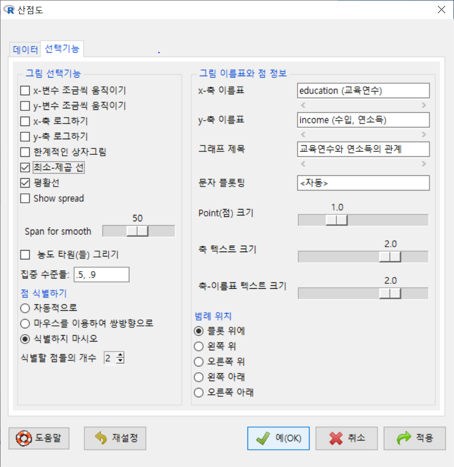 <선택기능> 창에 있는 <그림 유형(하나 또는 둘 모두)>에 점/줄(선) 모두 선택해보자. 물론 <그림 이름표>에 내용을 추가할 수도 있다.