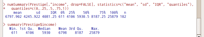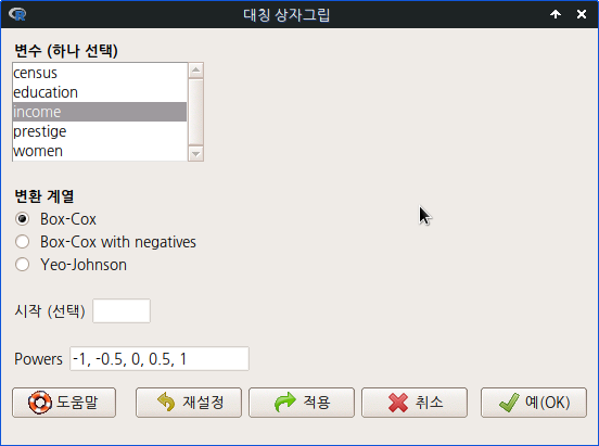 y=list(relation='same')), data=Prestige, xlab="income (연소득)", ylab="prestige