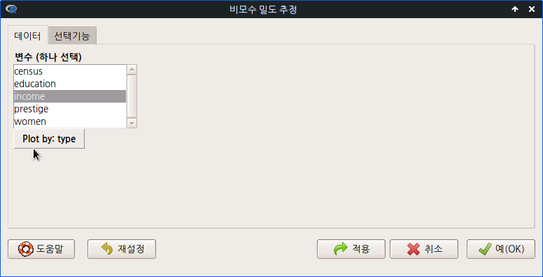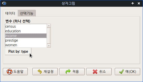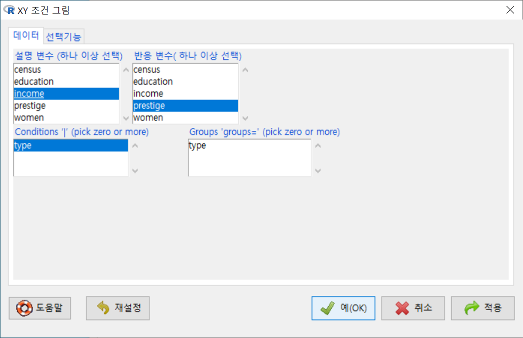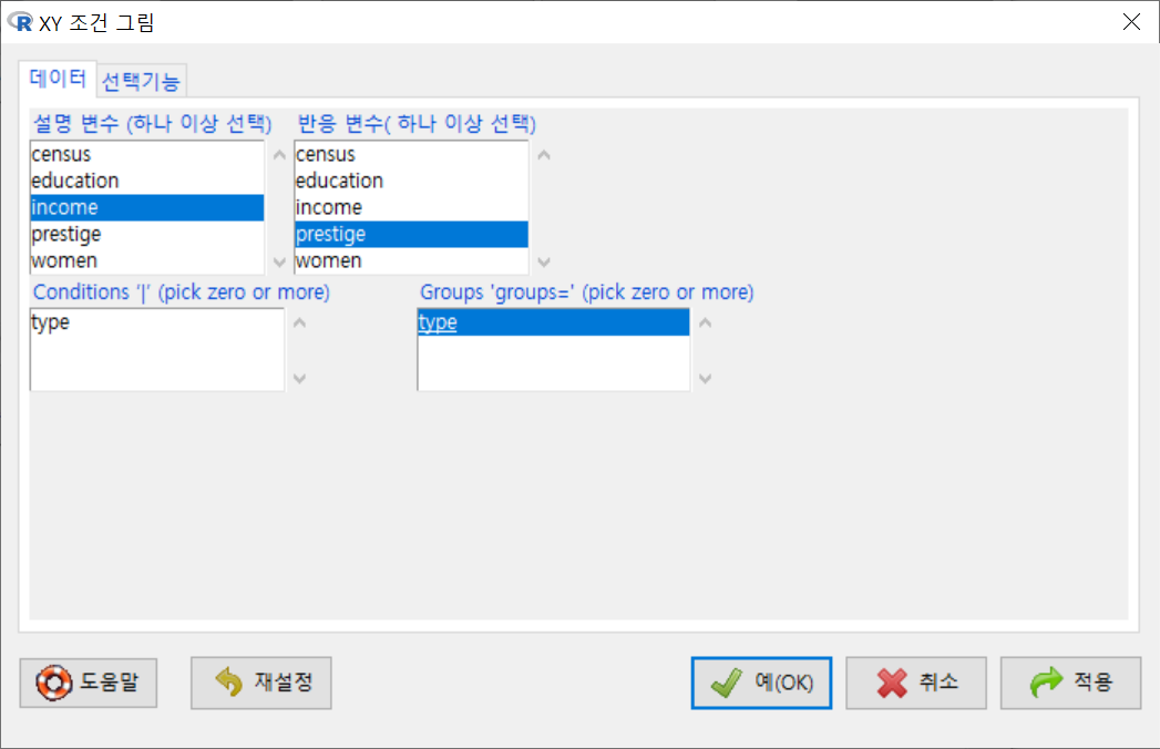 아래 그림은 직업유형 변수인 type을 "Groups 'groups='에서 해제하고, Conditions'|'에 선택한다.