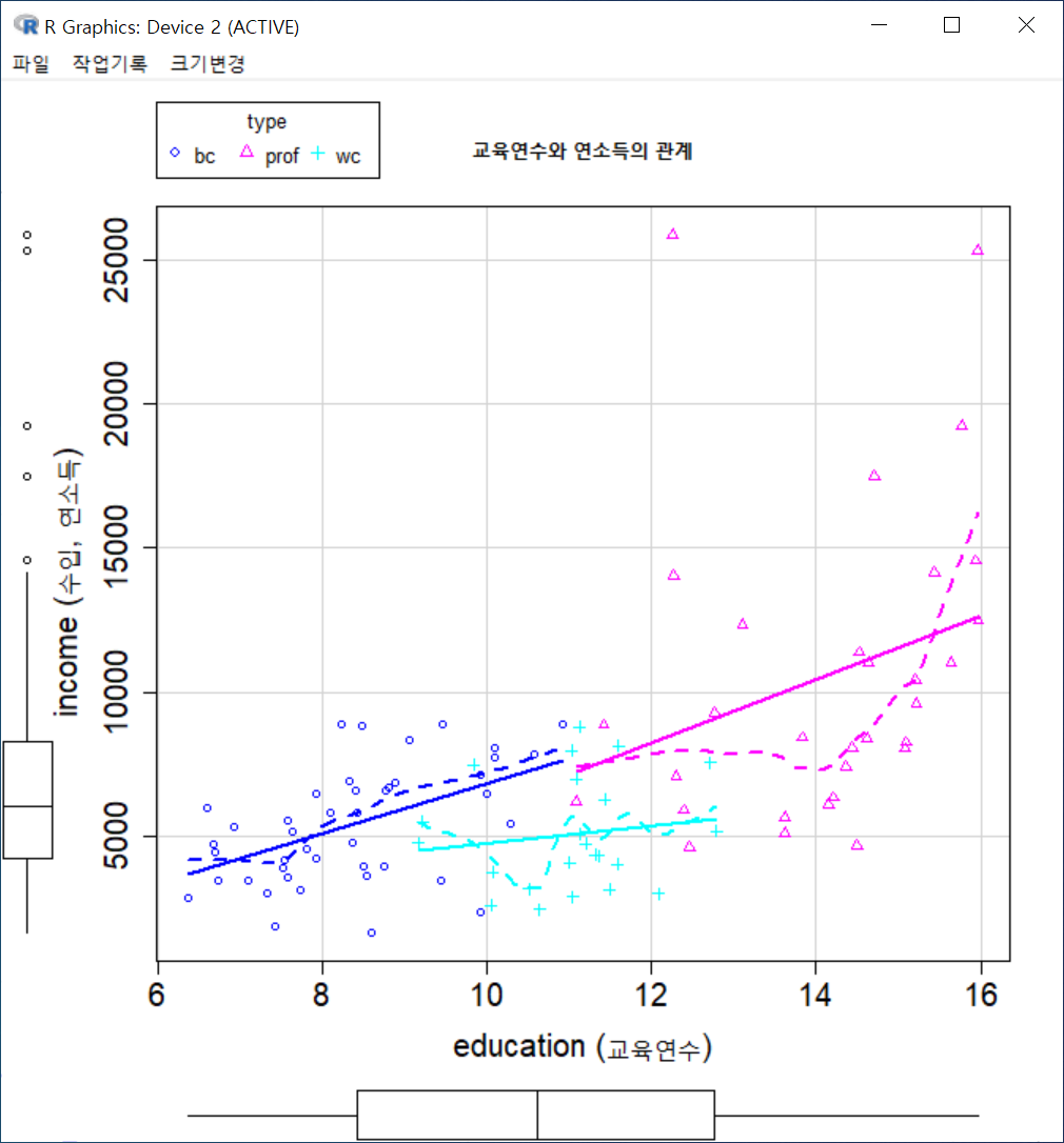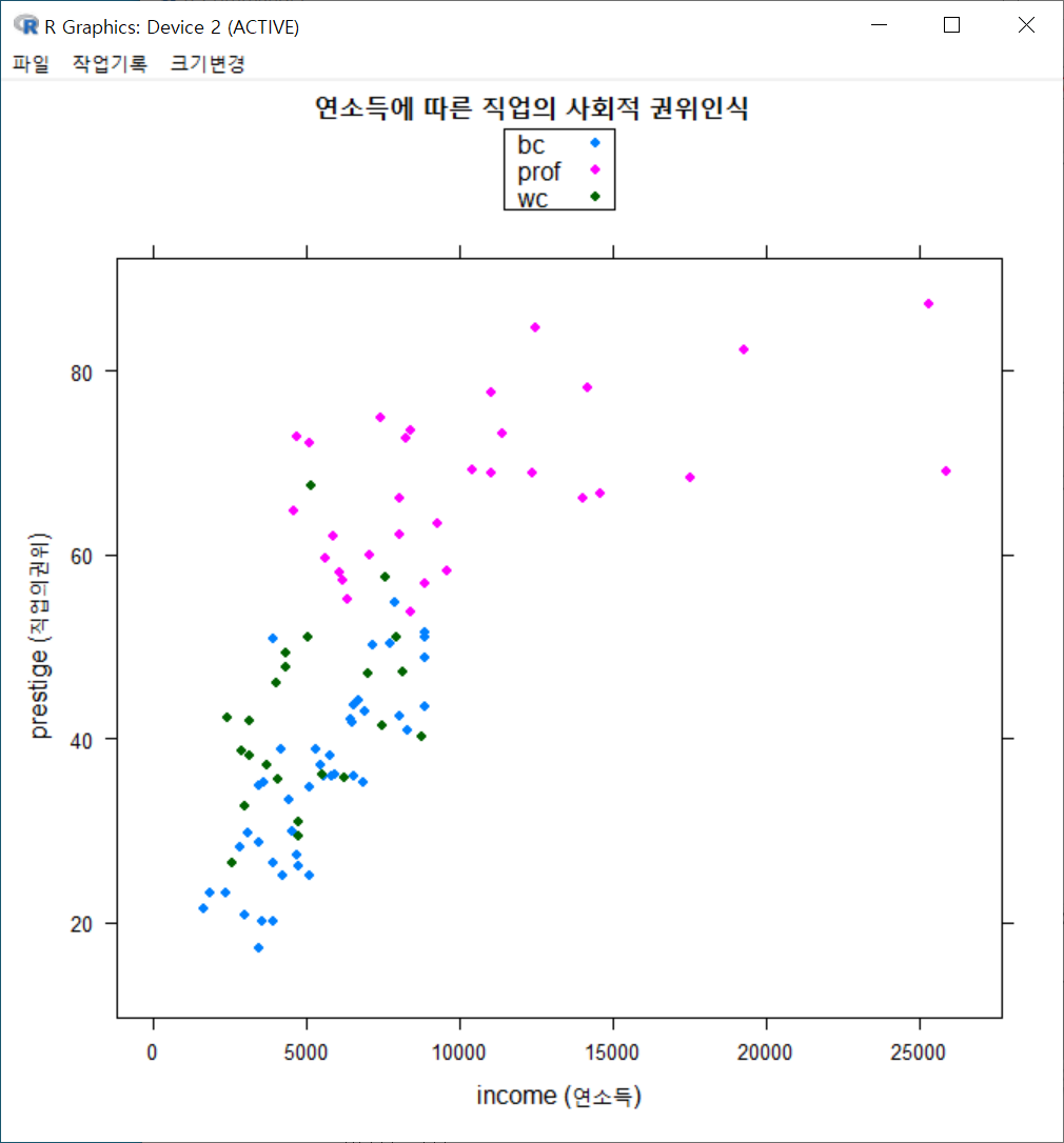 그래픽장치 창에 아래와 같은 그래프가 출력된다. 직업유형을 뜻하는 type 변수의 수준인 bc, prof, wc 수준의 범례가 보인다. 그리고 그 색깔별로 점들이 찍혀 있어, 추가적인 이해를 제공한다.
