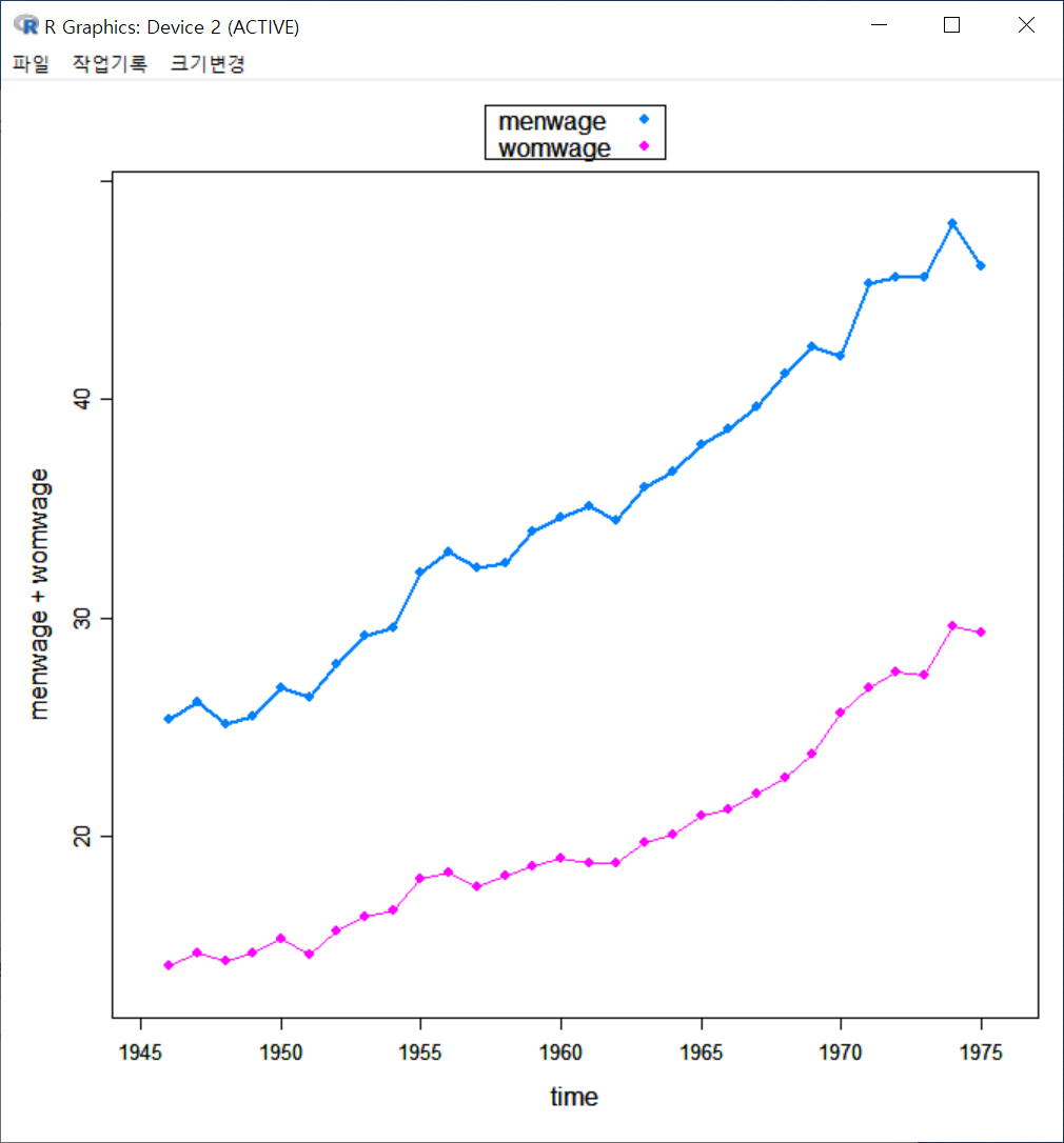 xyplot(menwage + womwage ~ time, type=c("p", "l"), pch=16, auto.key=list(border=TRUE),