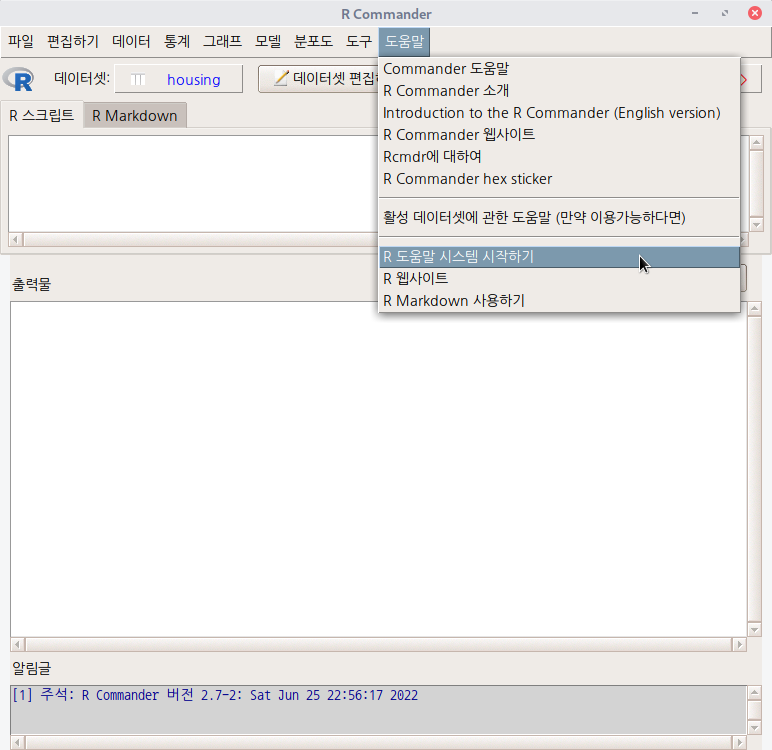 도움말 > R 도움말 시스템 시작하기