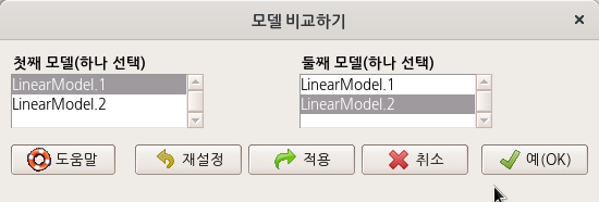 LinearModel.1과 LinearModel.2라는 두 개의 모형을 만들고 두 개의 모델을 비교하는 방법이다. 모델 > 가설 검정 > 두 모델 비교하기...의 메뉴를 선택하면, 만들어 놓은 두 개의 모형을 비교하는 기능을 이용할 수 있다. 직관적으로 두개의 모형을 차례로 선택해보자. 그리고 예(OK) 버튼을 누른다.