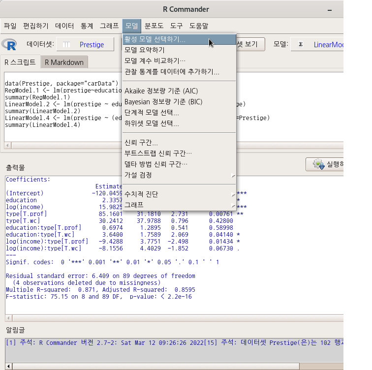 R Commander 상단에는 메뉴 목록이 있다. 오른쪽 끝부분에 <모델: 모델이름>이 활성화되면 데이터셋으로 분석 모델을 만들었다는 의미가 된다. 그런데, 여러개의 모델을 만들면서 다양한 각도로 분석적 통찰력을 키우는 경우가 일반적이다. R Commander에서는 분석과정에서 만들어진 여러개의 모델을 메모리에 상주시키고, 상황에 맞게 활용할 준비를 갖춘다. 아래의 명령문 프롬프트 창은 세개의 모델이 있음을 알린다. carData 패키지의 Prestige 데이터셋을 이용하여, 선형회귀, 선형모델 기법을 통하여 education(교육연수), income(연소득)이 prestige(직업의 사회적 권위)에 어떤 영향을 미치는가, 또 직업유형별로 차이가 있는가를 분석한다고 가정하자.