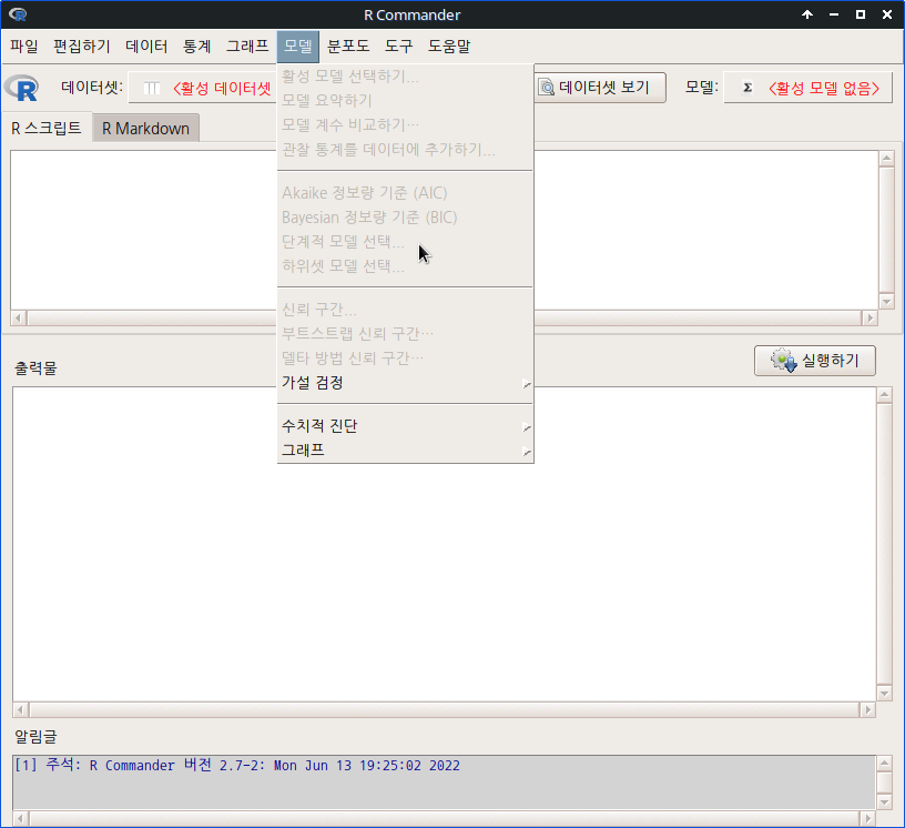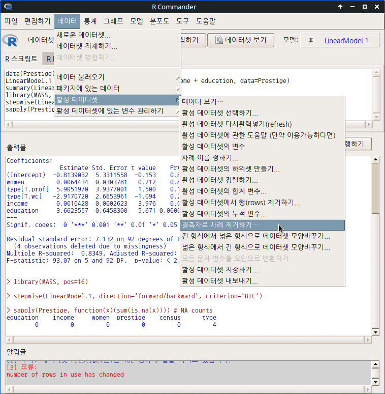 그런데 stepwise() 함수의 연산결과가 나오지 않고, R Commander의 맨 아래에 있는 메세지창에 오류문이 출력된다.