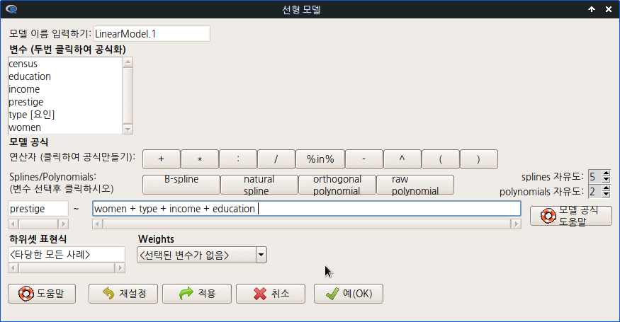 '통계 > 적합성 모델 > 선형 모델...'의 메뉴를 선택하면 아래와 같은 모형 만들기 창이 등장한다. 아래와 같이 변수들을 선택하여 입력하고, 예(OK) 버튼을 누른다.