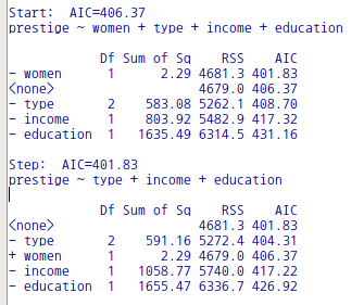 그래서 나온 다음 단계가 'Step: AIC=401.83'이다. 그 아래의 삭제될 변수의 AIC값들은 모두 401.83보다 높다. 추가로 변수를 삭제하지 않는 <none>의 AIC값, 다른 말로 하면 type + income + education 세개의 설명변수를 담고 있는 선형모델이 적합도가 가장 높다는 뜻이다.