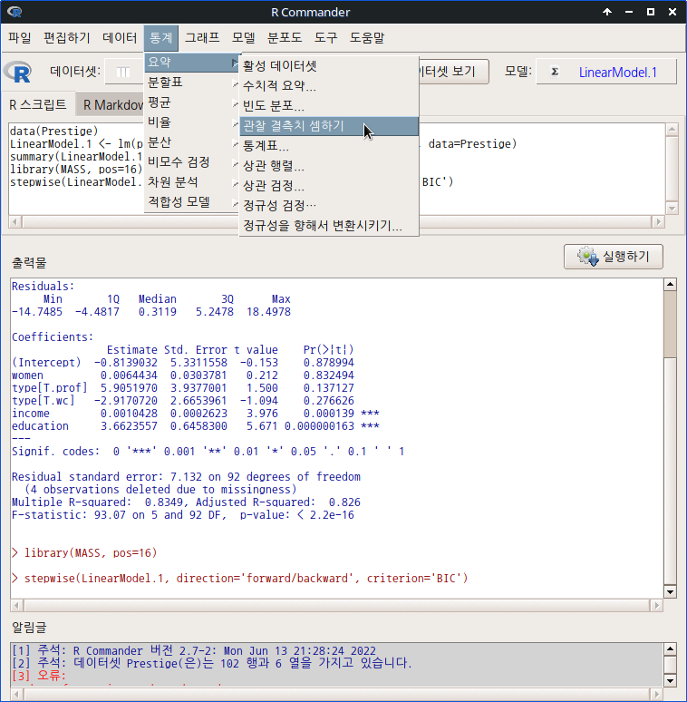 결측치를 제거한 새로운 데이터셋 Prestige를 사용하여 첫 과정부터 다시해야 한다. 아래와 같이 진행된다.
