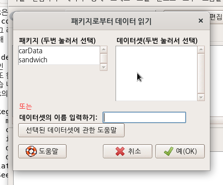 만약 Rcmdr 패키지가 호출될 때, sem 패키지가 자동으로 호출된다면, '데이터 > 패키지에 있는 데이터 > 첨부된 패키지에서 데이터셋 읽기...'에 sem 패키지가 carData, sandwich 처럼 메뉴창안의 패키지 목록에 포함되어 있어야 할 것이다. 하지만, 위의 화면에선 보이지 않는다. sem 패키지를 추가로 호출해주어야 한다는 뜻이다.