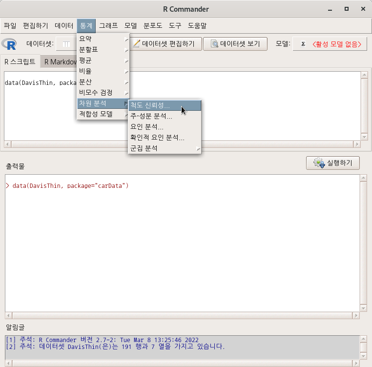 R Commander를 설치하는 과정에서 의존패키지인 sem이 함께 설치된다. 안내가 나오면서 추가 설치를 하겠는가 물어보기도 한다. 위의 화면처럼, sem 패키지에 포함된 함수를 사용하는 <확인적 요인 분석...> 기능은 처음에는 비활성화되어 있다.