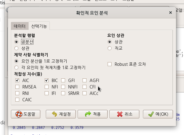 6. fit.indices라는 옵션에 AIC, BIC 두개의 통계지수가 포함되어 있는데, 이것은 <선택기능> 창의 기본설정이며, 원하는 지수를 추가로 선택할 수 있다. CFI, RMSEA 등이 선택될 수 있다.