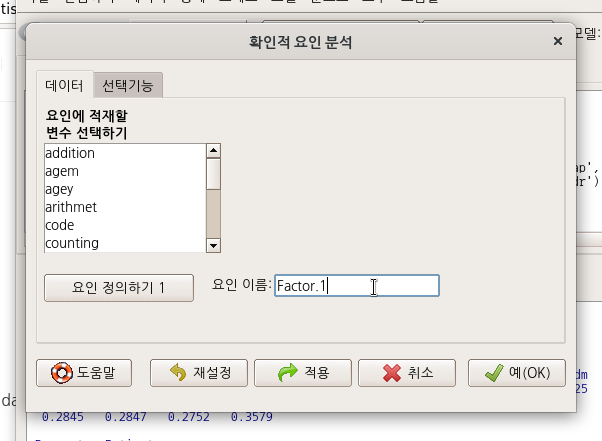 HS.data를 선택하자. HS.data 데이터셋이 활성화되면, 처음에 미활성화된 <확인적 요인 분석...> 메뉴가 활성화된다. <확인적 요인 분석...> 메뉴를 선택하면, 두개의 하위 창을 보게된다. 변수들을 선택하여 요인으로 묶는 <데이터> 창과, 연산을 통하여 획득하고자하는 통계지수(index) 목록의 <선택기능> 창이다.