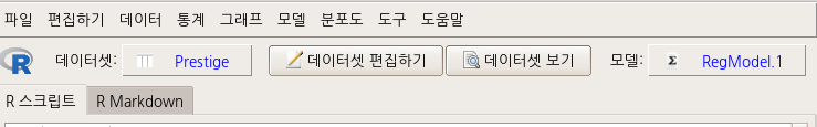 예(OK) 버튼을 누르면, R Commander 화면 상단에 있는 <모델:>옆에 파란색으로 RegModel.1이 등장한다.