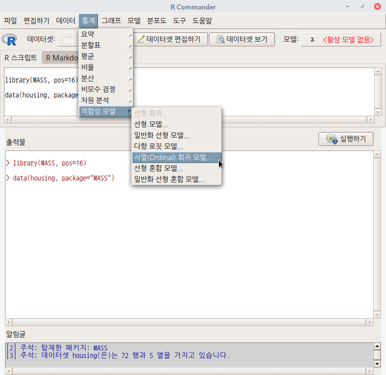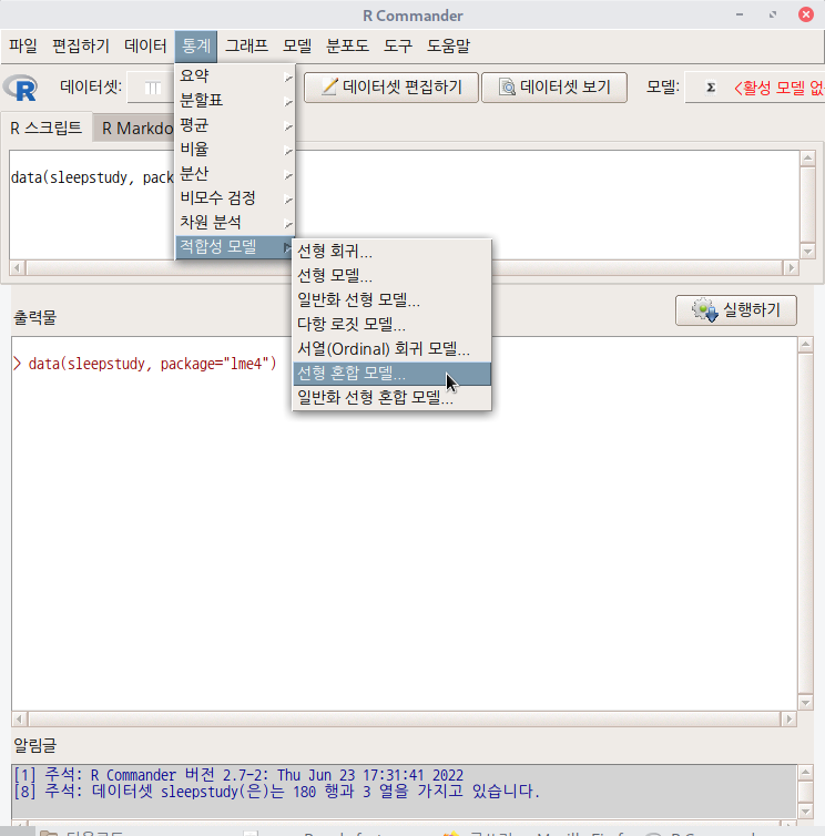 lme4::cbpp() data(cbpp, package="lme4") '도구 > 패키지 적재하기...' 메뉴 기능을 선택하고 lme4 패키지를 찾아서 선택한다. 그리고 '데이터 > 패키지에 있는 데이터 > 첨부된 패키지에서 데이터셋 읽기...'