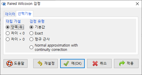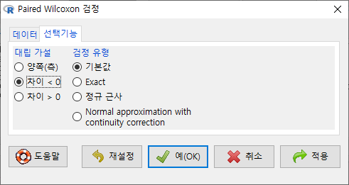 통계 > 비모수 검정 > 쌍-표본 Wilcoxon test...