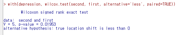 with(depression, wilcox.test(second, first, alternative='less', paired=TRUE))