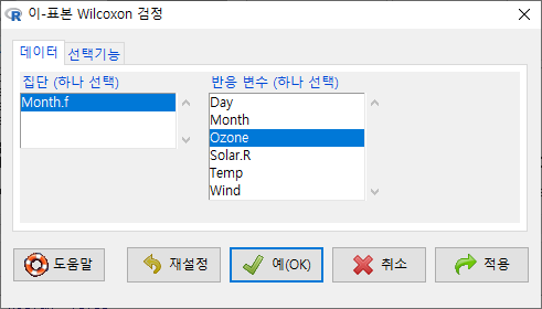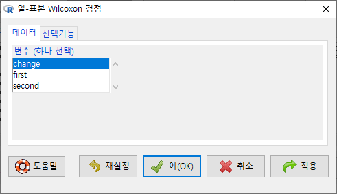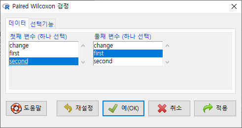 <선택기능> 창에 있는 기본 선택 사양을 그대로 사용해보자. <대립 가설>에서 '양쪽(측)'이 선택되어 있다. depression 데이터셋의 second 변수와 first 변수 사이에 순위 차이가 있는가를 살펴보는 것이라 할 수 있다.