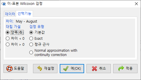 통계 > 비모수 검정 > 쌍-표본 Wilcoxon test...