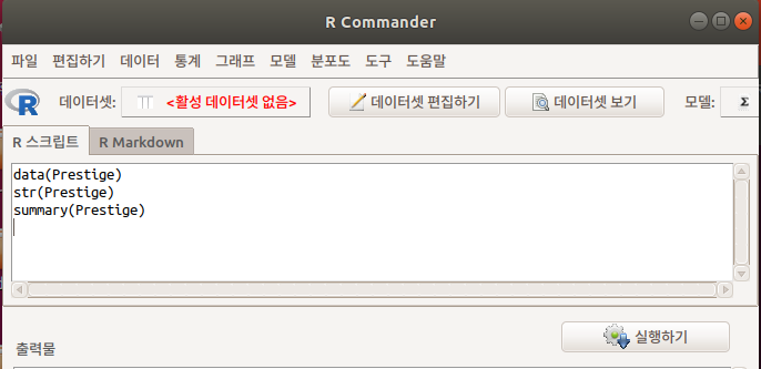 Nations라는 이름으로 불러온 데이터셋이 활성화되어 R Commander 에서 활용할 수 있는 환경이 시작된다.