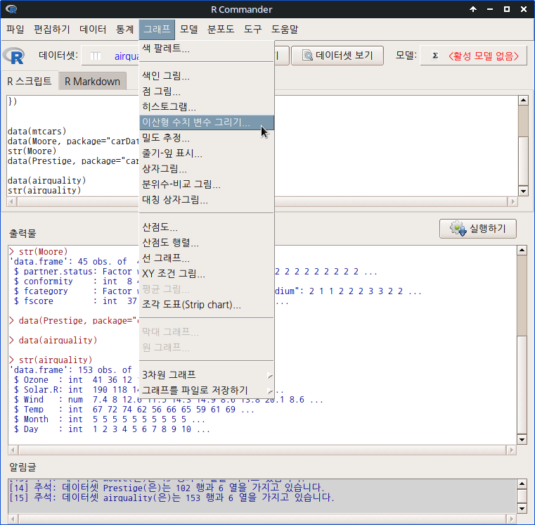활성데이터셋에 제한된 범위의 정수(integer, int)형 변수가 포함되어 있다면 <이산형 수치 변수 그리기...>가 활성화된다.