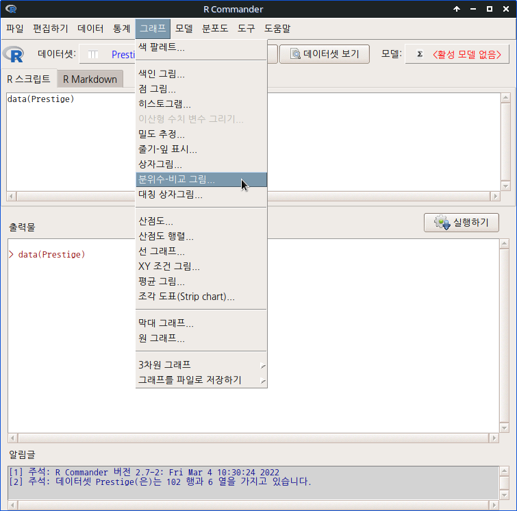 모델 > 그래프 > 잔차 분위수-비교 그림... Models > Graphs > Residual quantile-comparison plot... 데이터셋을 활성화시키고, 분석 모형을 만들었다면, '모델 > 그래프 > 잔차 분위수-비교 그림...' 메뉴 기능..