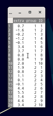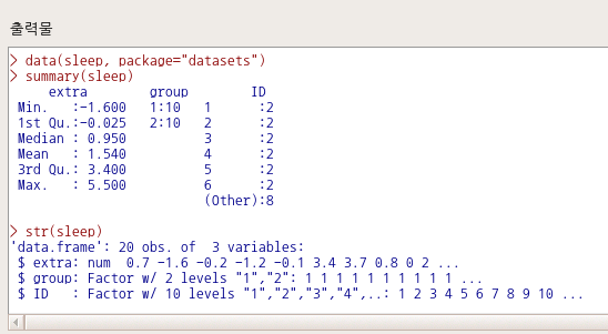 | [, 1] | extra | numeric | increase in hours of sleep |