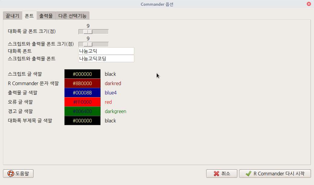 아래 메뉴 창에서 '대화록 글 폰트 크기(점)'을 9포인트로 바꾼다. '스크립트와 출력물 폰트 크기(점)'을 역시 9포인트로 바꾼다.