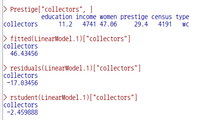 fitted(LinearModel.1)["collectors"] # prestige에 대한 모형 추정치 (과대?)