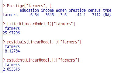 fitted(LinearModel.1)["farmers"] # prestige에 대한 모형 추정치 (과소?)