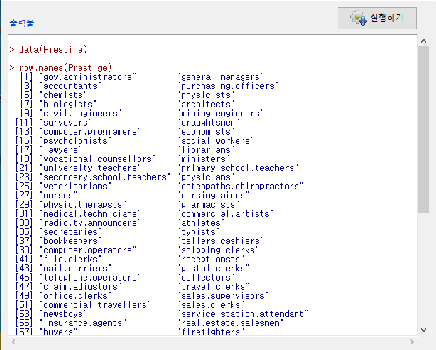 Prestige 데이터셋의 변수이름은 아래와 같이 문자형 정보를 담고 있다. 만약 숫자 형태의 일련번호가 있었다면, 직업 이름을 담고 있는 변수의 사례들을 행 이름으로 바꿀 수 있었을 것이다.
