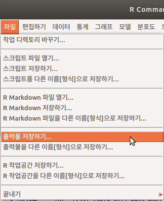 출력창에 나온 결과 값들을 파일로 저장한다. 이 파일은 기본설정으로 RCommander .txt 형식으로 되어있는데, 이름을 자유롭게 변경하여 저장할 수 있다.