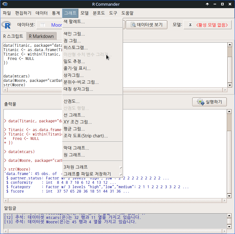 아래 화면에서 <산점도> <산점도 행렬...> 메뉴 기능을 찾아 보라. 활성 데이터셋에 수치형 변수가 3개 미만 포함되어 있다면 <산점도 행렬>이 비활성화되어 있을 것이다.