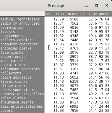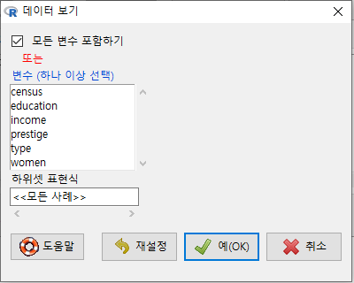 메모리로 불러온 데이터의 내부 값들을 볼 때 사용한다. 데이터프레임화 된 객체 전체를 보거나, 일부 변수들만 추려서 볼 수도 있다. carData 패키지에 포함된 Prestige 데이터셋을 사용하여 연습해보자. '데이터 > 패키지에 있는 데이터 > 첨부된 패키지에서 데이터셋 읽기...' 기능을 선택하여 Prestige 데이터셋을 선택하자. 그러면, R Commander 상단의 '활성 데이터셋 없음'이 'Prestige'로 바뀐다. 이후 '활성데이터셋 > 데이터 보기...'를 선택하면 아래와 같은 메뉴창이 등장한다.