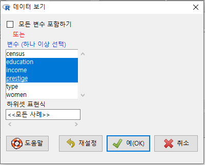 데이터셋에 대한 이해가 깊어지고, 분석의 대상의 명확해지면서 소량의 변수를 중심으로 데이터를 살펴볼 경우도 있다. 이 때는 '모든 변수 포함하기' 설정을 해제하고 필요한 변수들만으로 제한할 수 있다. Prestige 데이터셋에서 교육연수와 수입(연봉)이 직업의 권위에 대한 인식에 어떤 영향을 미치는가를 연구주제로 정했다고 하면, education, income, prestige 등의 변수로 제한할 수 있다: