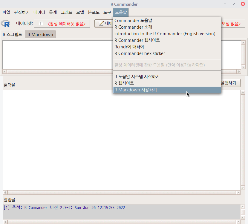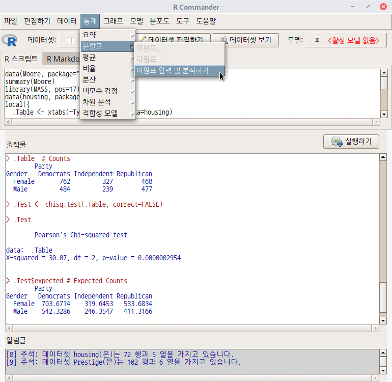 '통계 > 분할표 > 이원표 입력 및 분석하기...' 메뉴 기능을 선택하면 하위 창이 등장한다. '변수 이름', '행과 열의 수', '사례 수' 등을 입력할 수 있다. 아래의 내용은 'chisq.test' 함수 도움말 문서에 나오는 사례를 입력한다. 아래의 입력 스크립트를 참조 할 수 있다.