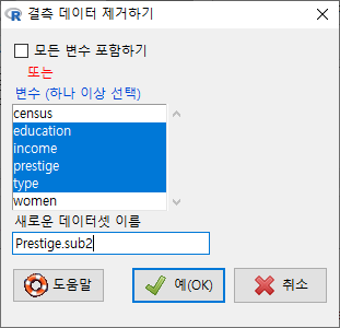 또 하나, 불편한 점이 있다. <행 이름 쓰기>와 관련된 것이다. <행 이름 쓰기>를 하고 저장한 파일에는 변수이름이 한자리 앞으로 오는 문제가 있다. 행 이름 위의 빈 칸에 첫 변수 이름이 쓰여지기 때문이다. 엑셀이나 다른 도구에서 행 이름 위에 있는 변수 이름을 이동시켜야 하는 불편함이 있다. 그렇다고 행 이름을 안쓰는 것도 문제가 될 수 있다. 일련번호는 상관없겠으나 사례 이름이 삭제되면 정보량이 축소되기 때문이다. 그래서 사례이름을 추가적인 변수명으로 사용하는 꼼수가 흔한 상황이다.