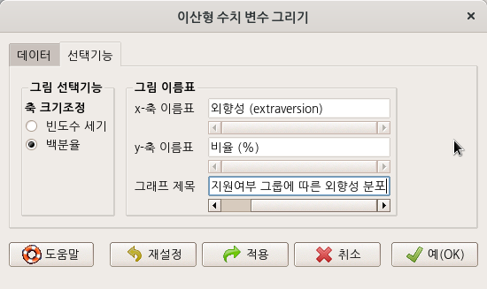 <선택기능> 창의 선택 기능중에서 <축 크기조정>에 '백분율"을 선택한다. 그리고 <그림 이름표>에는 내용적 이해를 돕는 사항들을 넣을 수 있다.