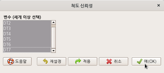 <척도 신뢰성> 창에서 <변수 (세개 이상 선택)> 기능에서 DT1부터 DT7까지 일곱개의 변수를 선택하고, 예(OK) 버튼을 누른다.