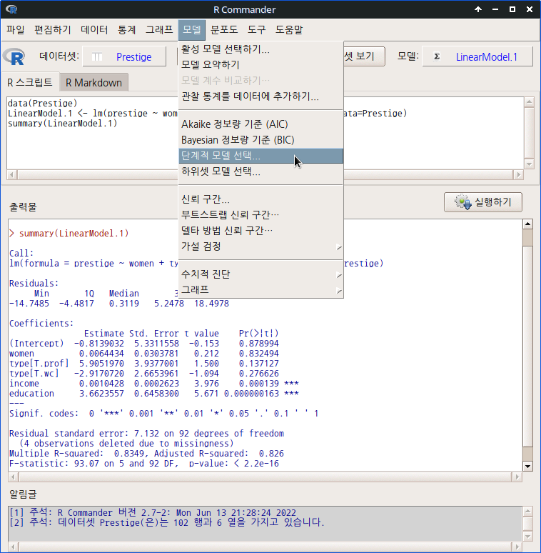 한편, '단계적 모델 선택...'기능에서 'BIC'가 선택된 기본설정을 그대로 사용하였음에도 불구하고, 분석의 내용에는 모두 AIC로 되어 있다. 이 상황에 대한 설명은 stepwise() 함수의 도움말에 나와있다: