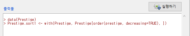 R Commander의 화면에서 활성 데이터셋이 Prestige.sort2로 바뀐다. 그리고 출력창에 새로운 함수 용례가 다음과 같이 등장할 것이다. 새로운데이터셋 <- with(활성데이터셋, 활성데이터셋[order(기준변수1이름, 기준변수2이름, decreasing=TRUE), ])