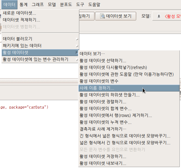 활성 데이터셋으로 사용되는 데이터프레임은 행과 열을 갖는다. 변수이름이 열을 대표한다. 행의 경우, 일련번호로 사례를 대표하기도하고 고유한 이름을 붙이기도 한다. 이 기능은 행의 이름을 지정하는 것이다.